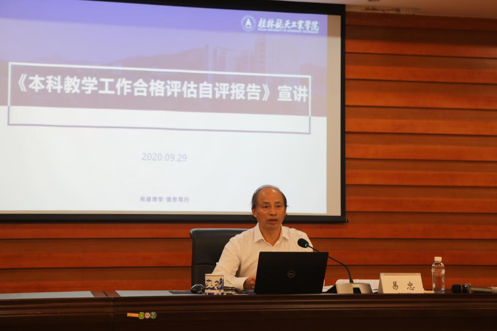 为进一步凝聚共识和全力推进学校本科教学合格评估工作,9月29日下午,我校本科教学工作合格评估自评报告宣讲会在飞天520会议室召开,校长易忠主持并作专题辅导。学校领导及全体中层领导干部参加学习。